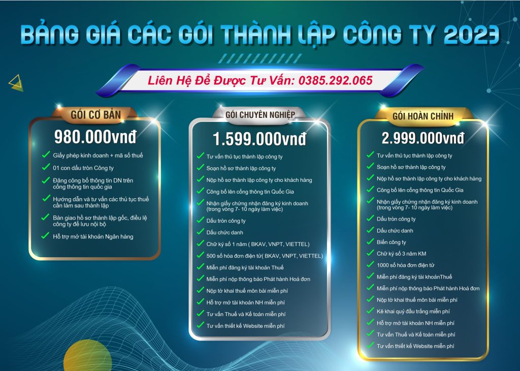 - Bảng giá + chi phí dịch vụ thành lập công ty trọn gói tphcm 2023